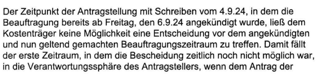 Der Antrag auf Kostenübernahme wurde am 04.09.2024 und damit vor Inanspruchnahme der Mietleistung gestellt. Der sozialrechtliche Grundsatz der rechtzeitigen Antragstellung ist damit erfüllt.