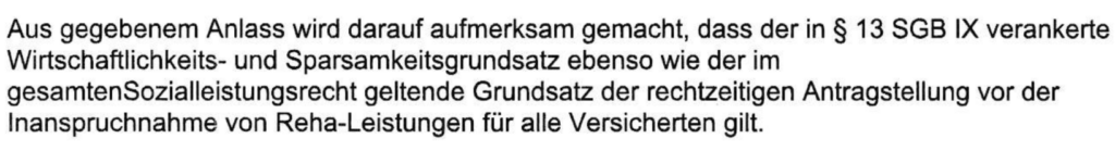Das gesamte SGB enthält keine Regelung, wonach zwischen Antragstellung und tatsächlicher Inanspruchnahme einer notwendigen Reha-Leistung ein Mindestzeitraum einzuhalten wäre. Maßgeblich ist allein, dass der Antrag vor Leistungsbeginn gestellt wird.