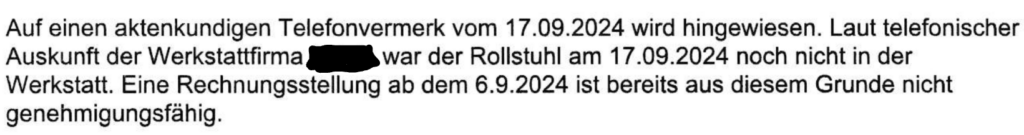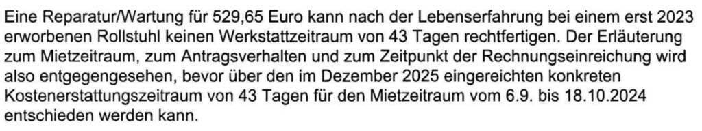 Ihr Verweis auf ein datenschutzrechtlich fragwürdiges Telefonat mit der “Werkstattfirma” ist für dieses Verwaltungsverfahren unbeachtlich. Maßgeblich ist weder der Zeitpunkt der Abholung noch die Auslieferung in die Werkstatt, sondern die tatsächliche Gebrauchsunfähigkeit des Rollstuhls.
